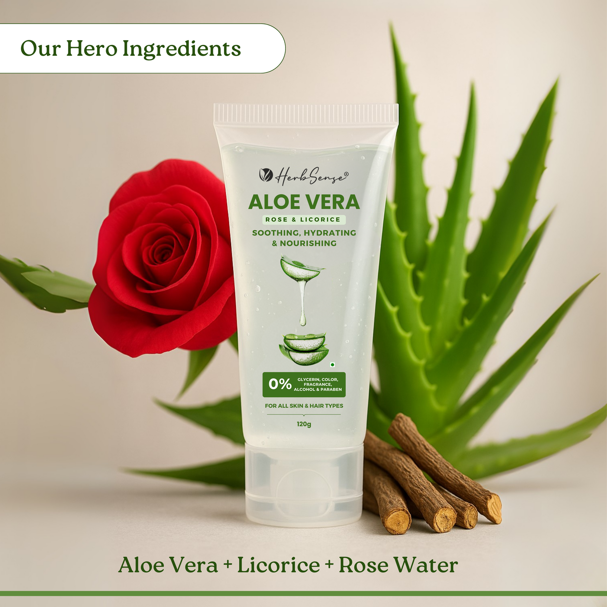 Aloe Vera Gel with Rose Water & Licorice, Soothing, Hydrating, Nourishing Gel for Face, Hair, Skin, 120g, 0% Glycerin, Color, Fragrance