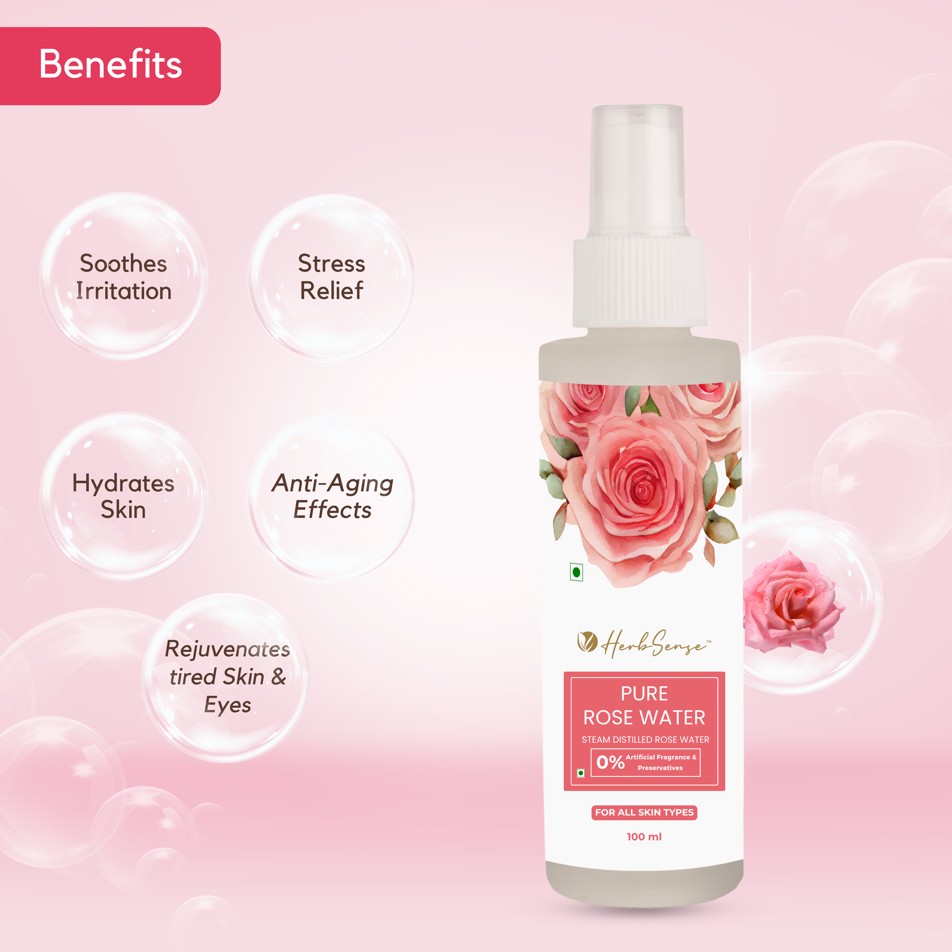- Herbsense Rosewater acts as an excellent facial toner by maintaining the skin’s natural pH balance with its astringent properties.