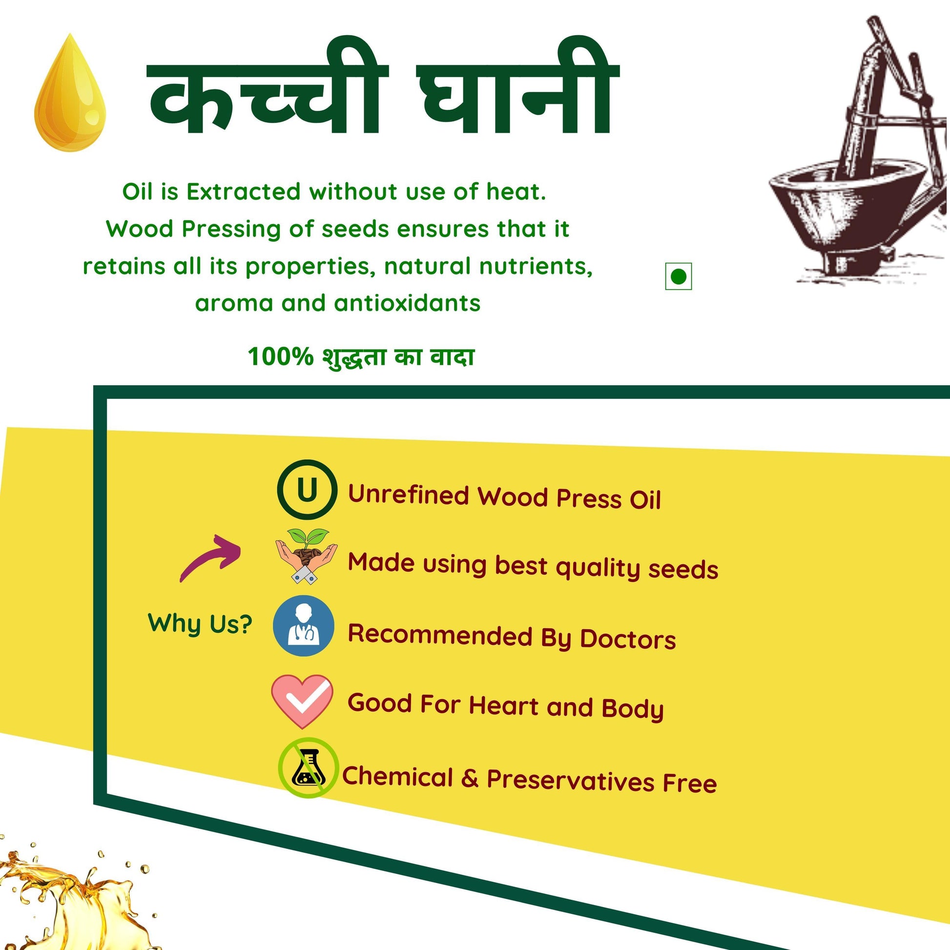 Experience the authentic and nutty flavor of our small-batch unrefined and cloth-filtered oil, pressed using traditional kachi ghani wood cold-pressed techniques. Our process ensures that the oil retains its natural aroma, viscosity, and nutrients.