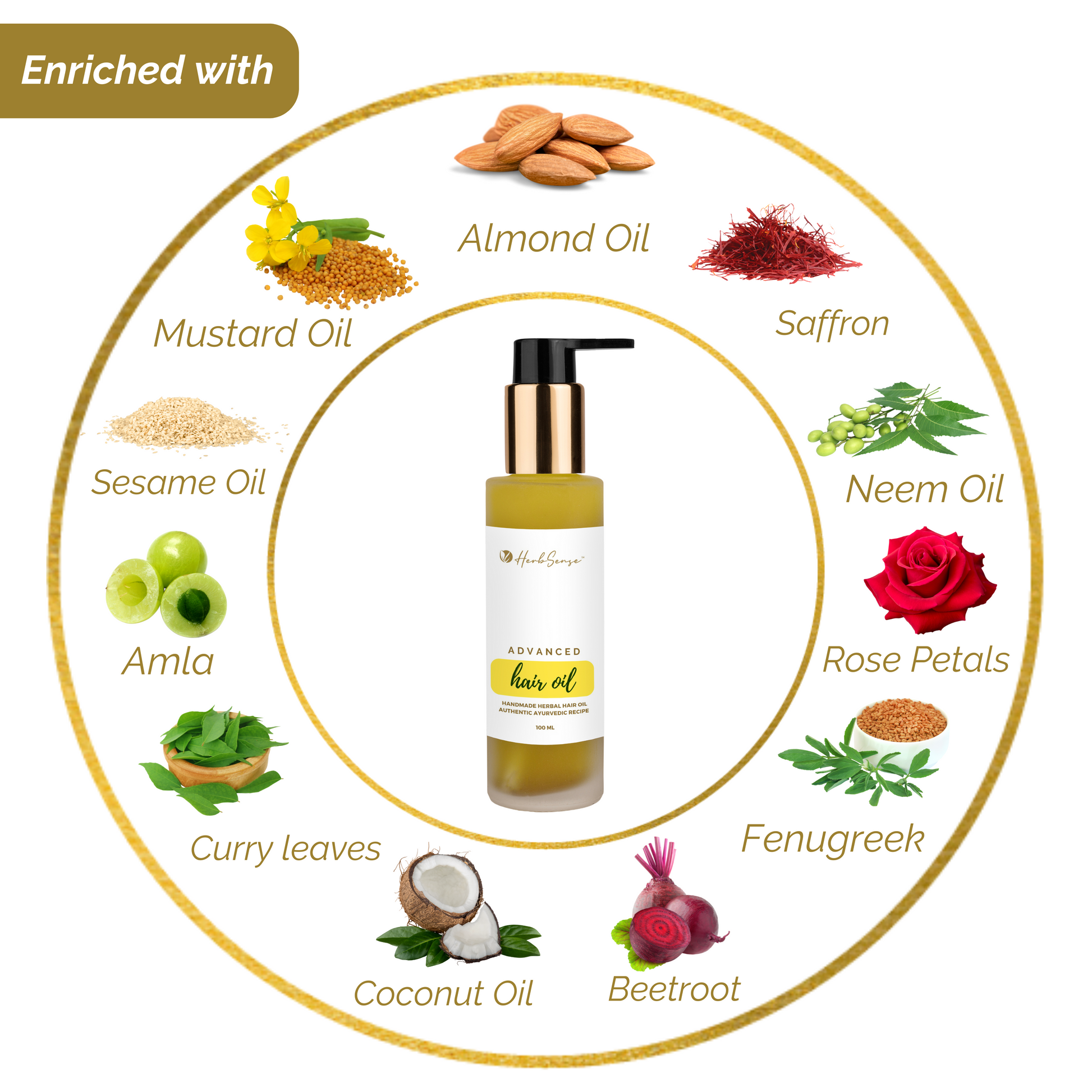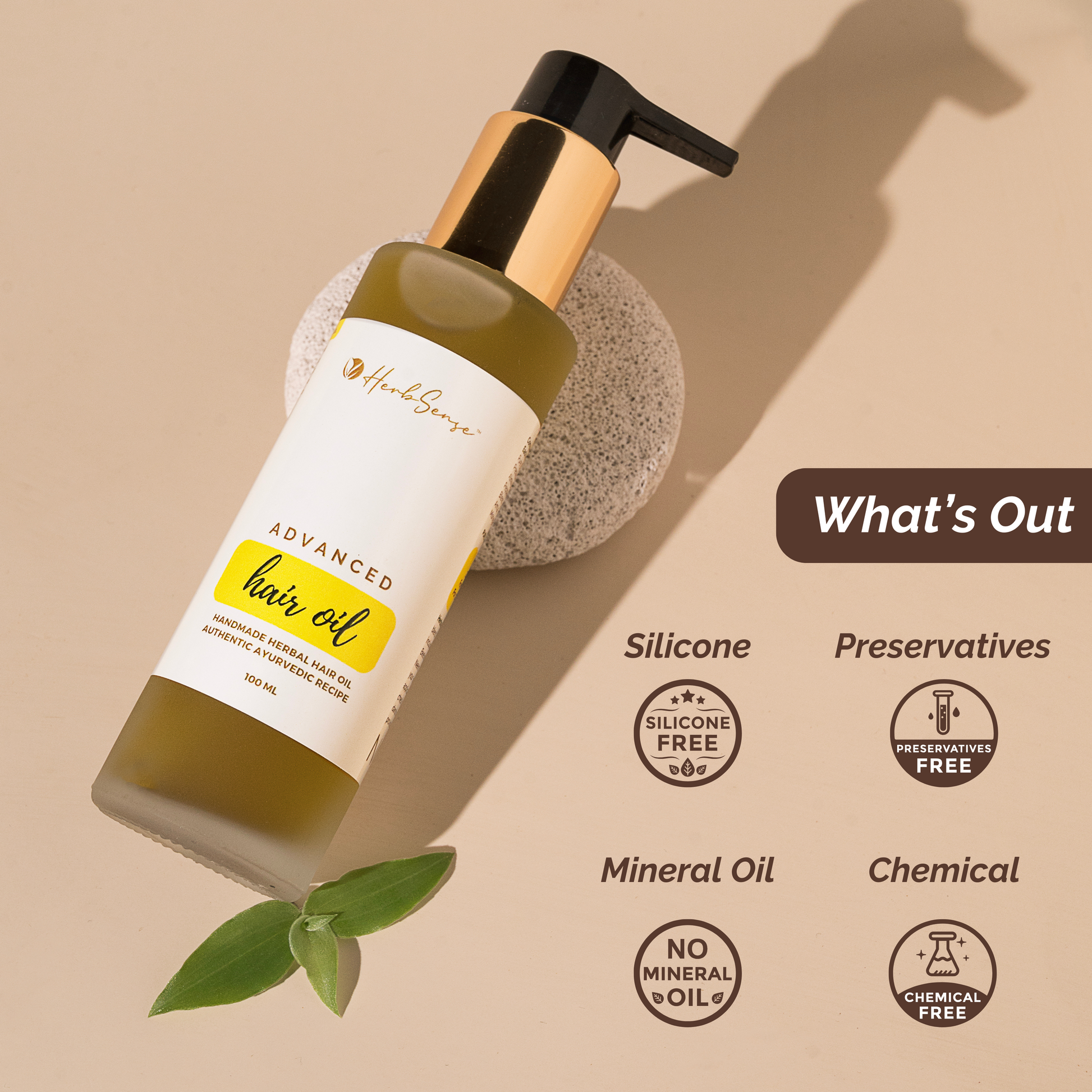 Herbsense Advanced Hair Oil is a special blend of ayurvedic ingredients, like Amla, Curry Leaves, Moringa, Beetroot, Black Seed, Fenugreek, Mustard, Neem, Almond, Coconut, and Sesame, for better hair health.